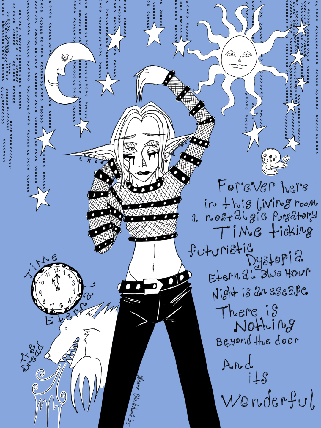 I ended up doodling something inspired by the song and video’s themes. It fit perfectly within my ‘Voidcreature’ world I’ve been privately creating for years, except this time, the void was full of stars rather than haunting eyes, and while it was still depressing with a dissociative flair, it was a comforting depression. It was the kind of dissociation that takes you away somewhere else that’s dreamlike and fascinating. The void creature in it wasn’t like the others; instead of a blank expression and almost no unique features, this void creature had a unique face with proper eyes, an expression of sadness, and an outfit that was inspired by Leo Lauren’s in Supernormal (which, I discovered, he made the shirt himself).